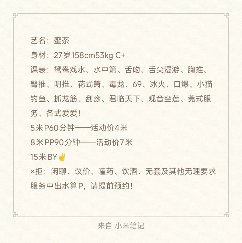 很热情开朗的姑娘,颜值中上,人照八分,胸C➕,身材匀称,口活无齿感,无纹身,能舌吻,看菜单,菜单上的都有,水多很润,顶级毒龙,会聊天不冷场,中间老师不累的情况下还有专业按摩,有茶歇吃,不催,个人最喜欢老师的翘肥臀和安排的满满的服务,房间环境温馨,回锅很多次,基本一个月四五次。AADLTTxt泰式按摩等等舌吻鸳鸯浴